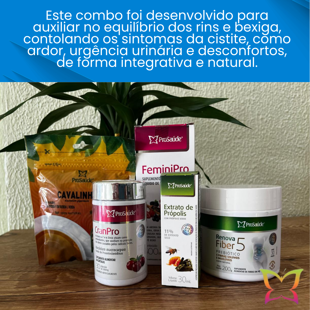 Neste combo selecionamos produtos que auxiliam o equilíbrio do Elemento Água, ligado aos rins e à bexiga, apoiando o organismo no controle dos sintomas da cistite, como ardor, urgência urinária e desconforto, dentro da saúde integrativa.