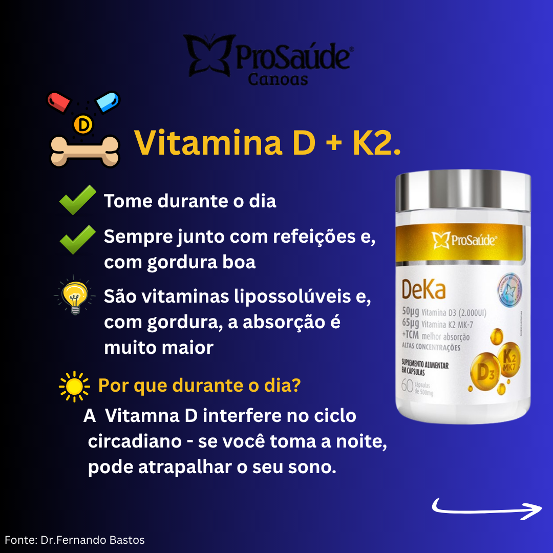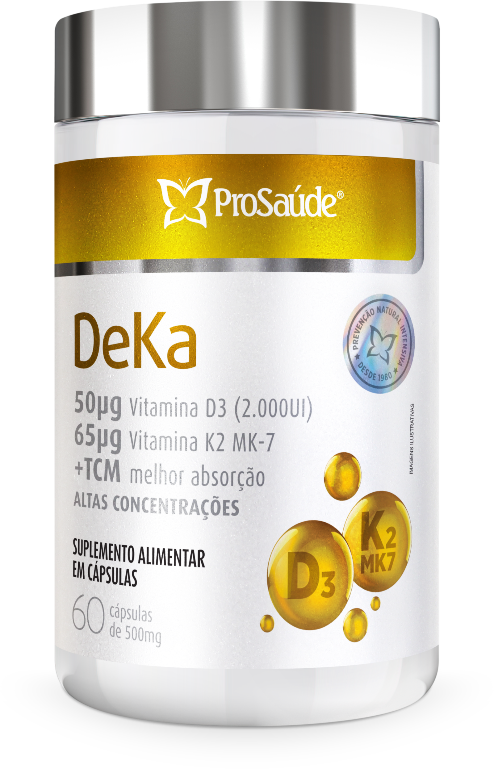 O DeKa da ProSaúde é um suplemento alimentar em cápsulas, composto por 50 mcg de Vitamina D3 (2.000UI) em conjunto com 65 mcg de Vitamina K2 MK7 e TCM (triglicerídeos de cadeia média) que auxilia na melhor absorção.