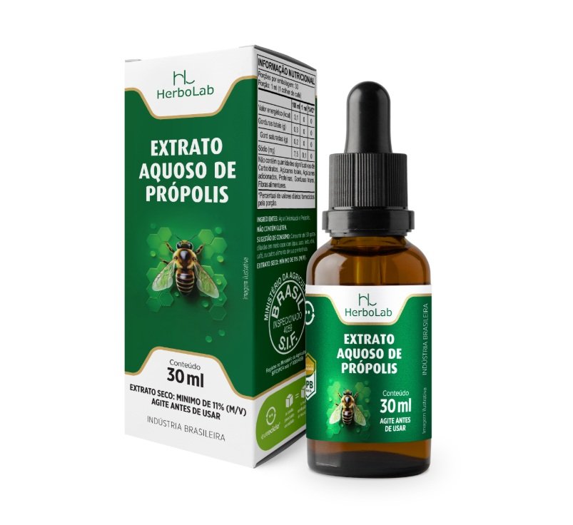 O Extrato Aquoso de Própolis da Herbolab é um suplemento alimentar formulado com extrato de própolis verde diluído em água deionizada, resultando em um sabor mais suave e agradável.