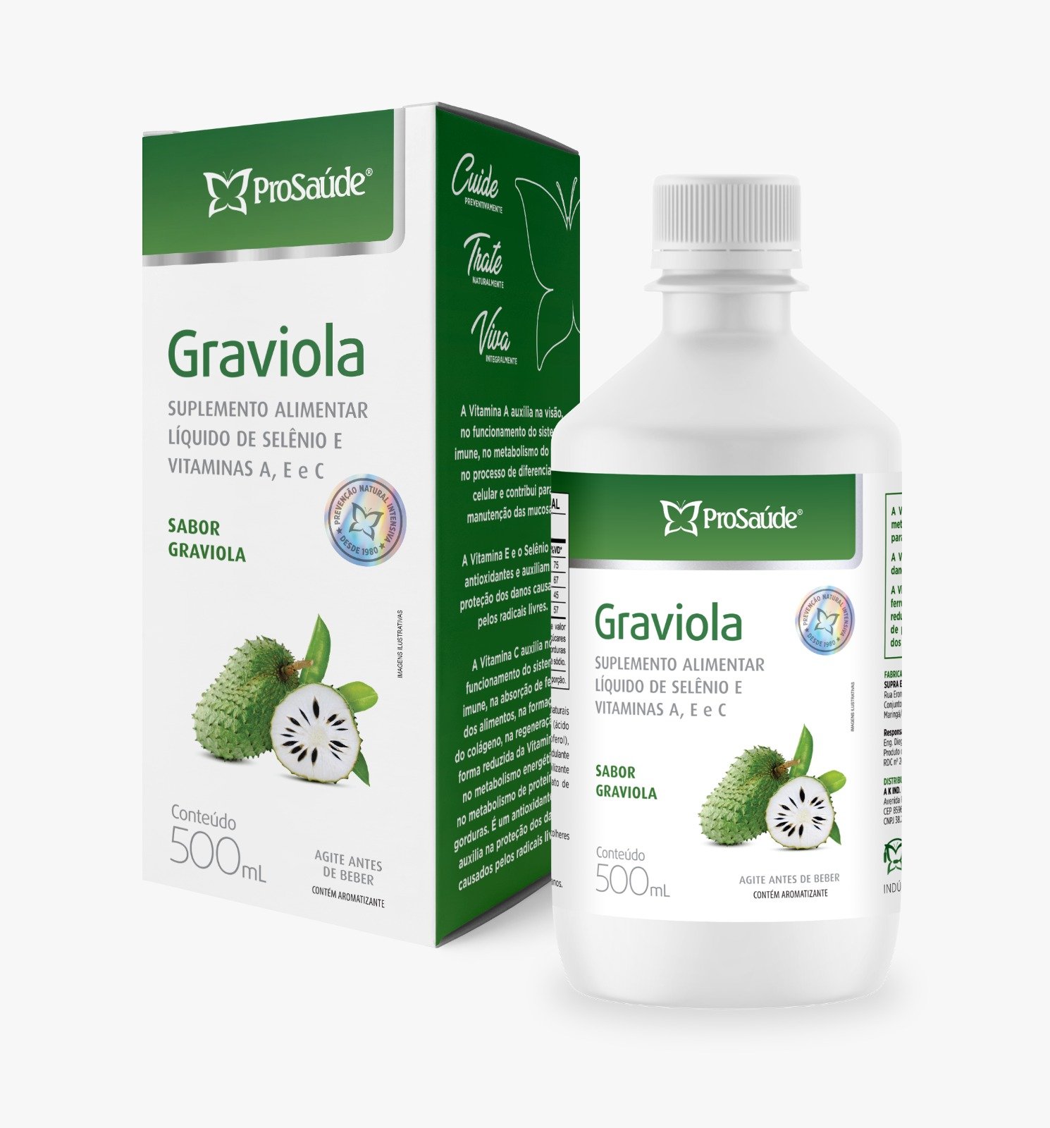 A Graviola ProSaúde é um suplemento alimentar líquido, composto pelas vitaminas A, E e C e pelo mineral selênio, com aroma natural de graviola.