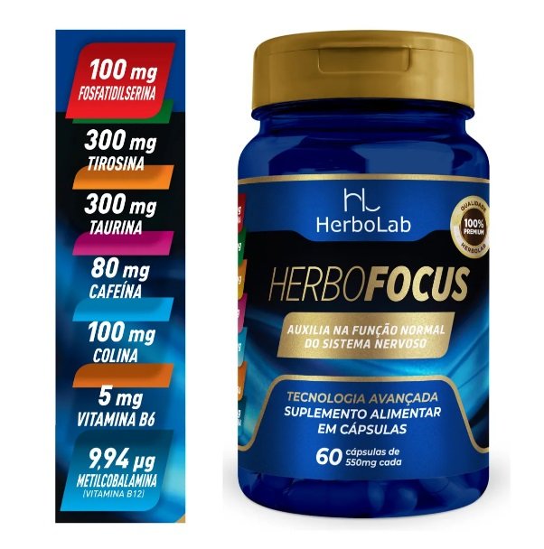 O HerboFocus da Herbolab é um suplemento alimentar em cápsulas composto por Fosfatidilserina, Tirosina, Taurina,