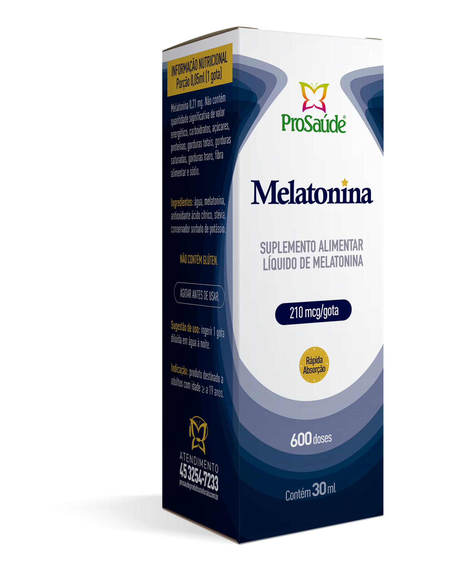 A Melatonina ProSaúde é um suplemento alimentar líquido elaborado com o hormônio melatonina. Contendo 210 mcg por gota, possui rápida absorção.
