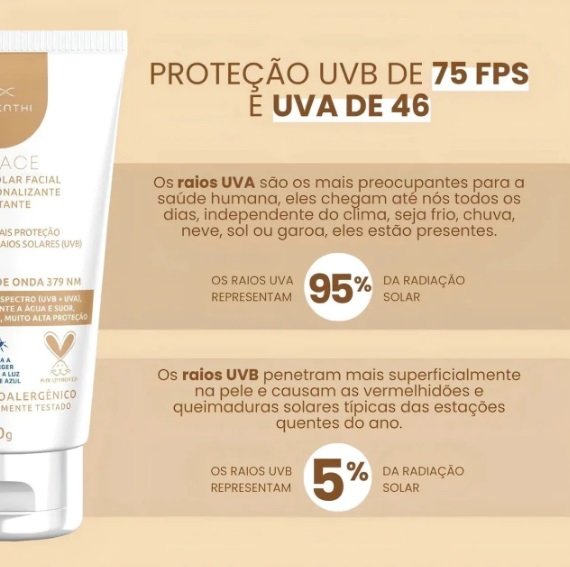 O Onface Protetor Solar FPS 75 possui toque seco, não oleoso e com uma cobertura excelente para o dia-a-dia. É um produto multifuncional já que otimiza o uso de vários produtos na sua maquiagem diária. Ele possui em sua formulação óleo de coco extra virgem que beneficiam a pele na hidratação, elasticidade e também colaboram na proteção solar. Formulado com alto índice de proteção física (dióxido de titânio) e uma combinação de filtros químicos que dão a segurança e a proteção necessária para o dia-a-dia do rosto.