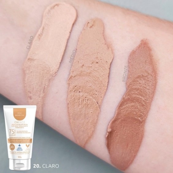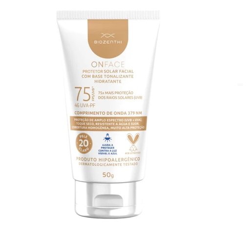O Onface Protetor Solar FPS 75 possui toque seco, não oleoso e com uma cobertura excelente para o dia-a-dia. É um produto multifuncional já que otimiza o uso de vários produtos na sua maquiagem diária. Ele possue em sua formulação óleo de coco extra virgem que beneficiam a pele na hidratação, elasticidade e também colaboram na proteção solar. Com base tonalizante hidratante